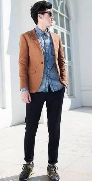 卡其色西裝+藍色牛仔襯衫+黑色牛仔褲,這樣的搭配時尚又顯活力,特別適合30歲左右的男生,這也是一種潮男的穿搭。