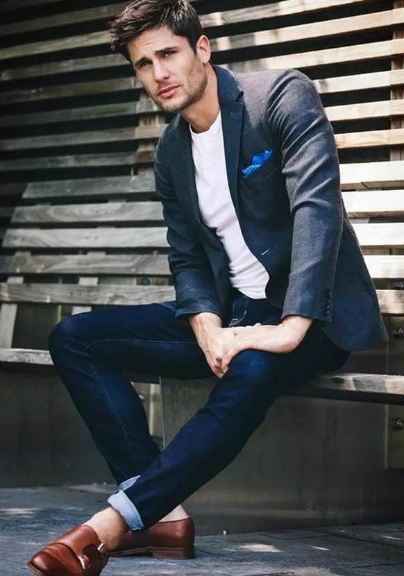 2、黑灰藍內搭T恤+牛仔褲;黑灰藍西裝也是比較常見的套裝西裝,避免太正式,可以選擇單西內搭T恤和深藍色牛仔褲,鞋子搭配可以選擇小白鞋或布洛克鞋,這效果也是不錯的,年輕時尚的男士可以選擇這樣來搭配。