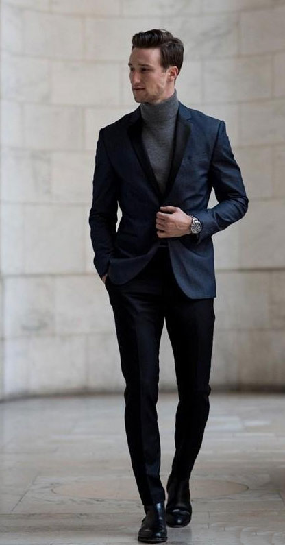3、深藍色單西內搭毛織衫+休閑黑色窄腳褲;可以多重提升并塑造出紳士的格調,同時于沉穩中見品味,不但展現自信,也顯儒雅的氣質。